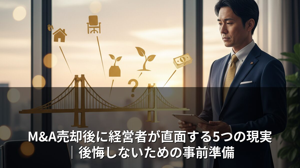 本記事では、M&A売却後に経営者が実際に直面する5つの現実を整理し、それぞれへの対処法・事前準備のポイントを解説します。これから売却を検討している方にとって、交渉や手続きの準備と同じくらい、「売却後をどう生きるか」のイメージを持っておくことが重要です。