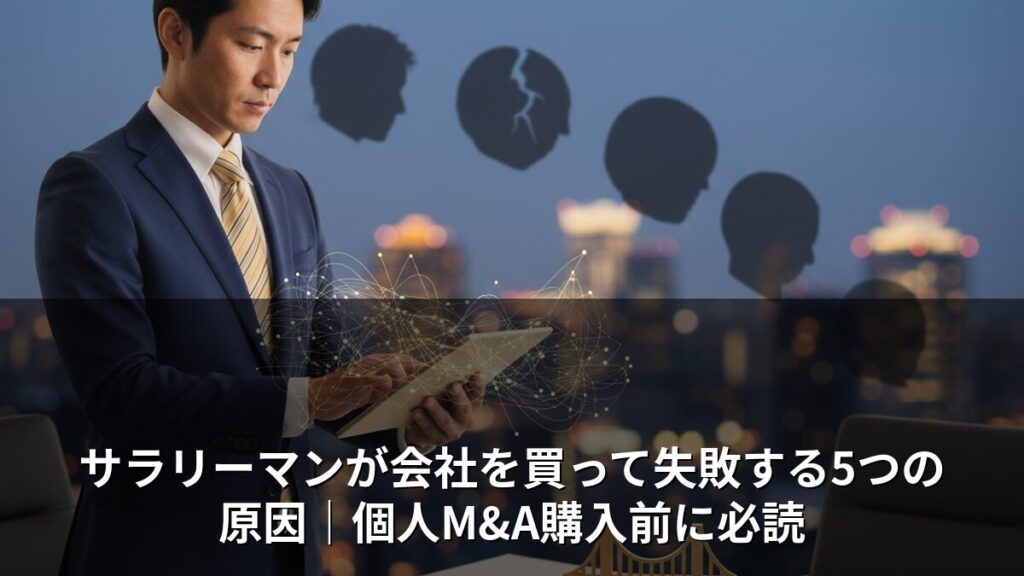サラリーマンが個人M&Aで会社を買い失敗する原因は5つに集約できます。DDの甘さ・資金計画・経営移行など、買収前に必ず確認すべき落とし穴と対策を実務経験者が解説します。 -