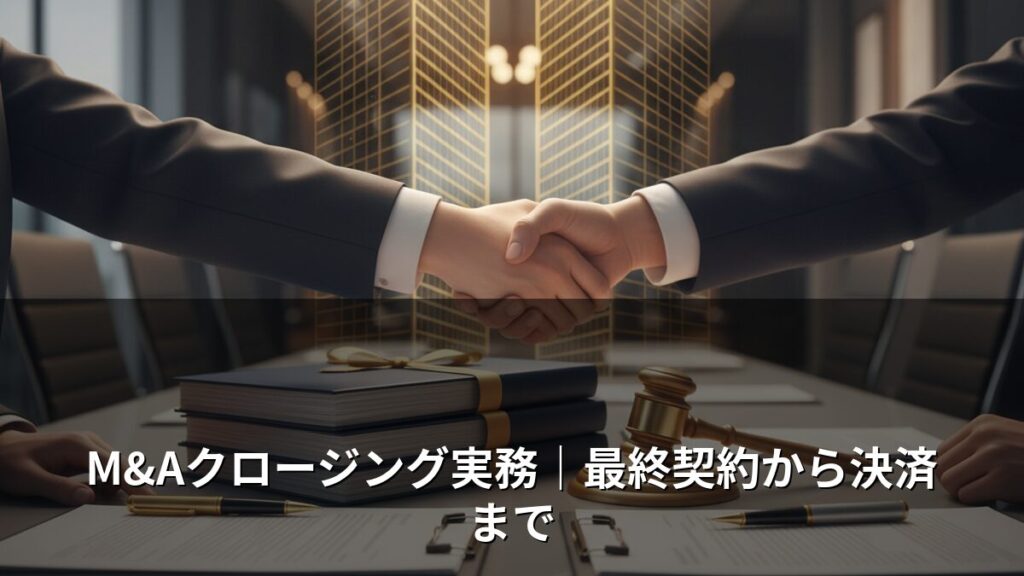 M&Aクロージング当日に何が起きるのか。最終契約書の締結・株式引き渡し・代金決済・登記変更まで、実務経験者が失敗しないための準備と注意点を徹底解説。